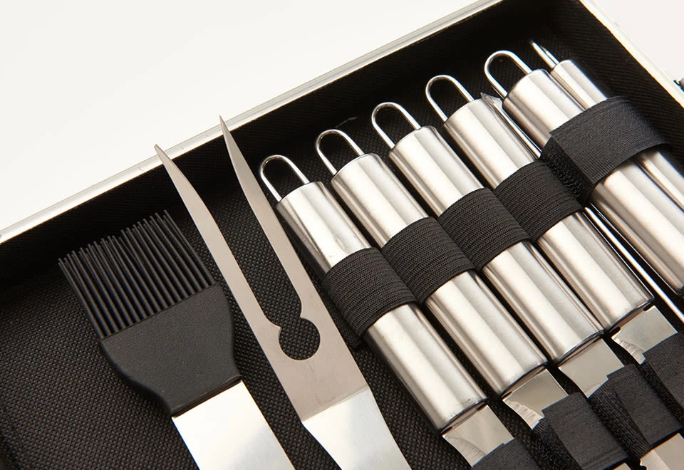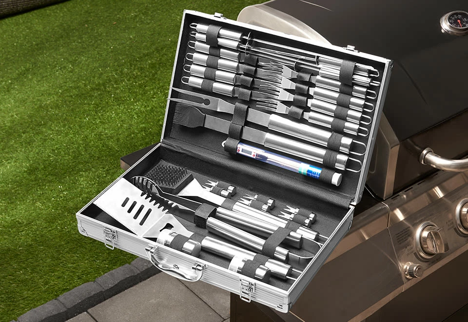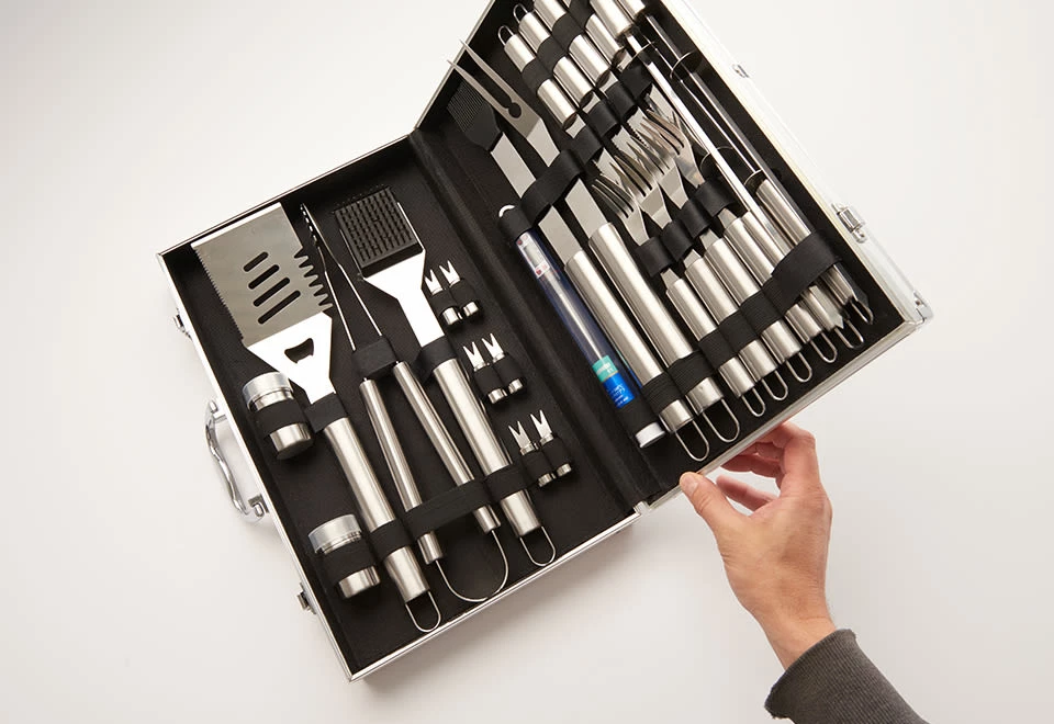 The 26-Piece BBQ Grill Set is a complete suite of tools in a durable aluminum case. It’s everything you need for a great night of grilling.