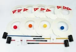 • 6 Hole Set includes 6 numbered flags, 4 rugged Yard Golf clubs (34” length) and 4 oversized Yard Golf balls